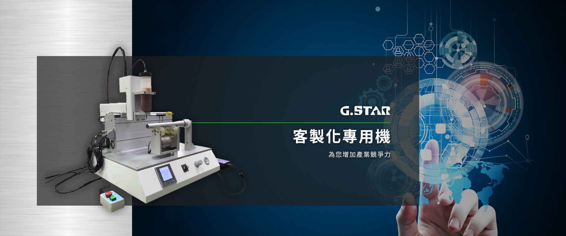 ABOUT 關於我們 / 為您提升生產效能的好幫手 吉上達實業有限公司 (G.STAR),成立於2001年,主要營業項目為面膜生產設備、止洩帶機、點膠設備、客製化專用機及為客代工等。多年來不斷研發改良與精進,從傳統產業到科技業…等,因應客戶與國際市場需求,提供迅速確實的售後服務。 ...